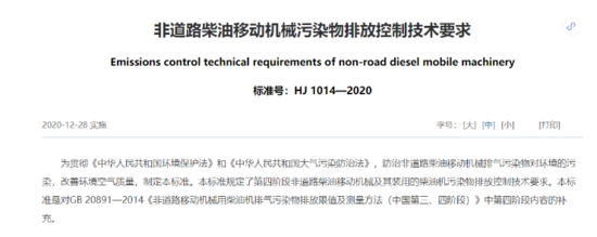 2020年12月, 生态环境部与国家市场监督管理总局联合发布了《非道路移动机械用柴油机排气污染物排放限值及测量方法(中国第三、四阶段)》(GB 20891-2014)修改单,并发布了其配套技术规范《非道路柴油移动机械污染物排放控制技术要求》(HJ1014-2020)。