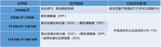 从国三到国四,不同功率段非道路移动机械采用不同的排放控制技术,增加成本有所不同。
